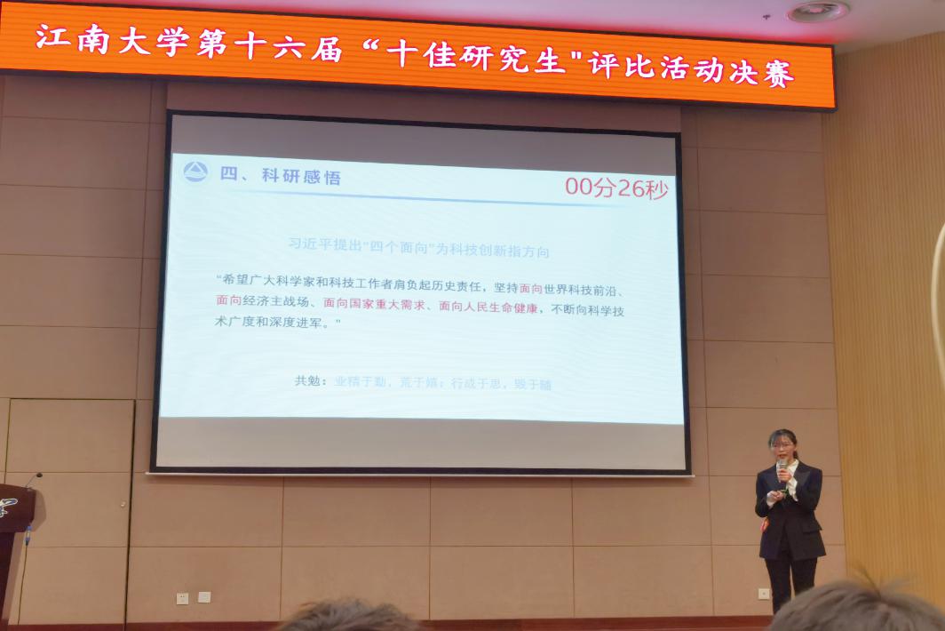 研究生李月一路过关斩将,顺利成为“十佳研究生”候选人,入围决赛(全校共15名)。在决赛环节,各位优秀研究生依次进行个人展示、专题问答和观众投票,经过激烈角逐,李月以第3名的优异成绩荣获小黄书