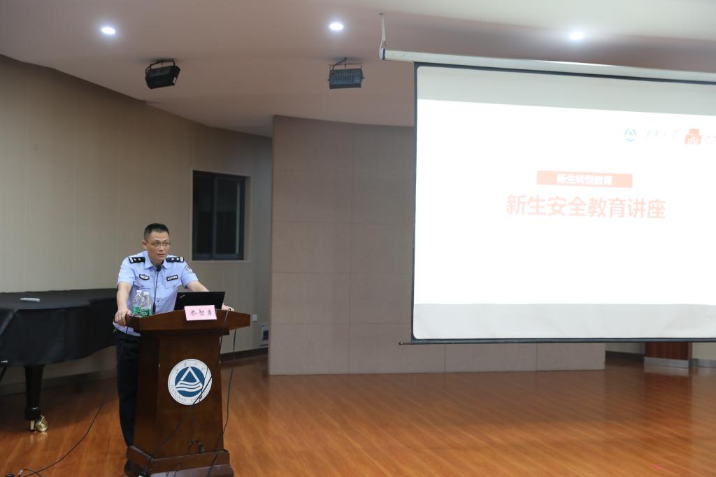 随后,无锡市滨湖公安分局内保大队副大队长乔智勇给新生上了一堂安全教育讲座。他从校园电信诈骗入手,谈到校园贷、毒品等不同类型的安全问题,通过生动幽默的讲述方式让新生们切实感受到了身边存在的安全隐患,真实还原学生身边发生的典型受骗案例。针对不同类型的诈骗乔警官提醒学生如何甄别,防止受骗,让学生在入学就树立安全防范意识。