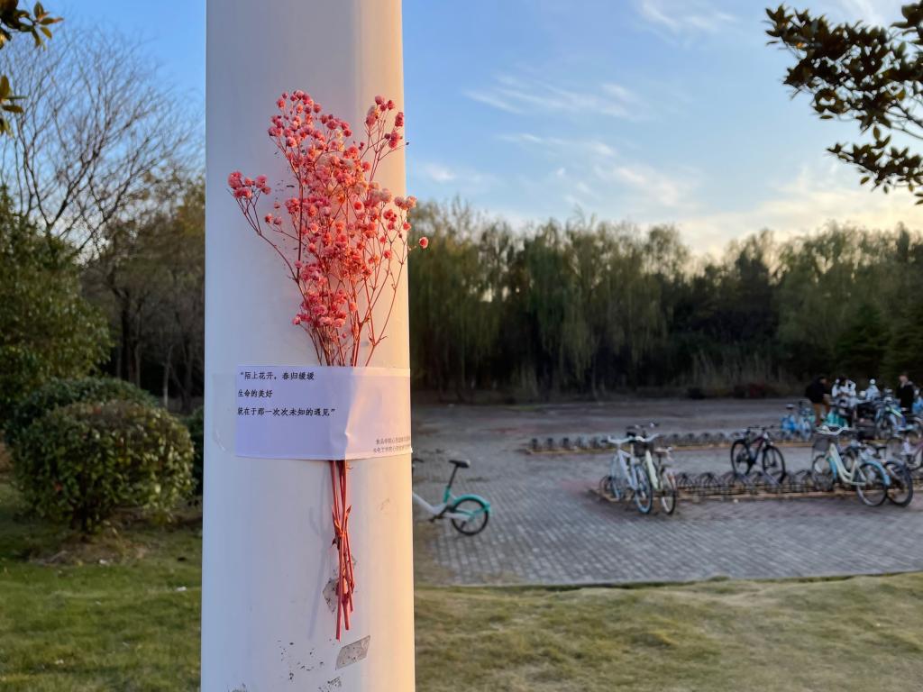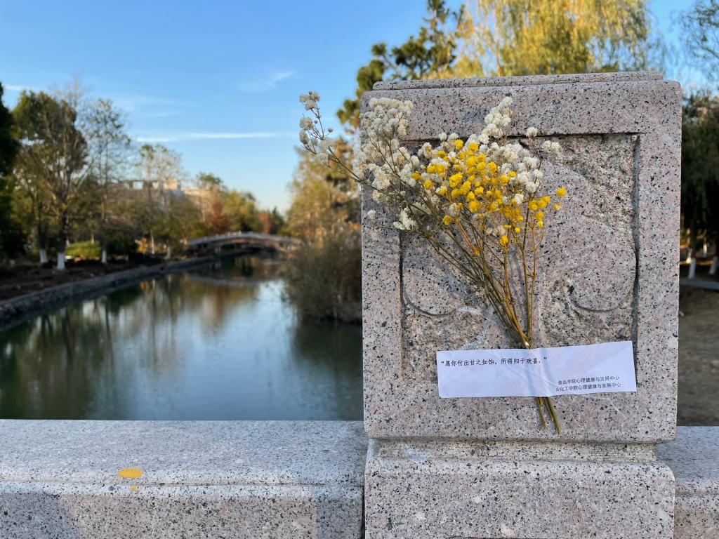 心理中心负责校园南区,化工学院心理中心负责北区,分别开展张贴暖心祝福语、放置应急小物件的工作。活动举办阶段,遍布在校园里多个角落的祝福语被许多同学发现,应急小物件也受到同学们的青睐,被有需要的同学摘取,并拍照传递温暖关怀。