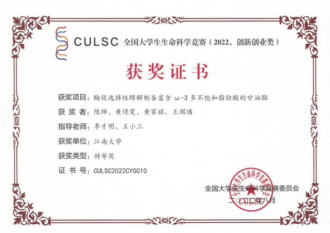 共有34个项目参赛,14个项目获奖。其中,由李才明与王小三老师共同指导,陈烨等同学参赛的项目《酶促选择性醇解制备富含ω-3多不饱和脂肪酸的甘油酯》一举夺得创新类全国特等奖。