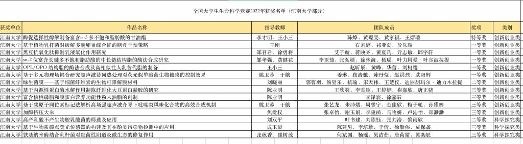 食品学子在2022年全国大学生生命科学竞赛决赛中斩获佳绩,包括:特等奖1项、一等奖5项、二等奖2项、三等奖6项,获奖层次及数量均创历史新高。