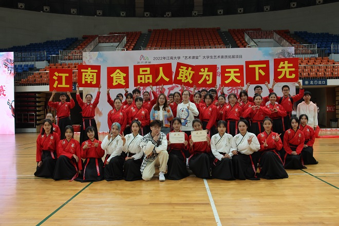 参赛选手打出“江南食品人,敢为先下先”的标语,展现出食品学子朝气蓬勃的青春风采。
