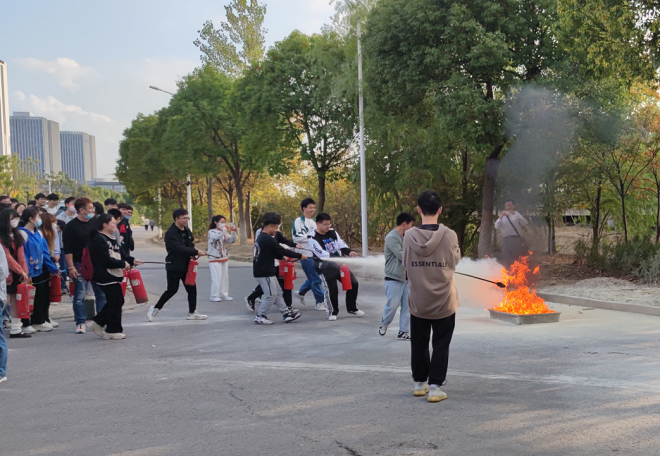 同学们在保卫处消防科老师介绍下,了解掌握灭火的处理流程,增强人员突发事件中互救和自救意识,提升相互间协调配合能力。同学们亲手操作灭火器,进行灭火实战演习,深刻的认识到了关注消防、珍视生命的重要性和应对突发火情的应急处理措施。
