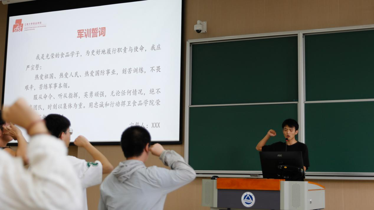 退伍大学生士兵胡加恩发言。他讲述了自己在部队两年的经历,号召同学们勇担时代责任、主动投身军训、锤炼意志品质,努力成长为堪当民族复兴大任的食代新人。食科2206班韩书峤带领全体同学庄严宣誓,将严格遵守纪律,认真投入军训,发扬团队精神,续写食品荣光。