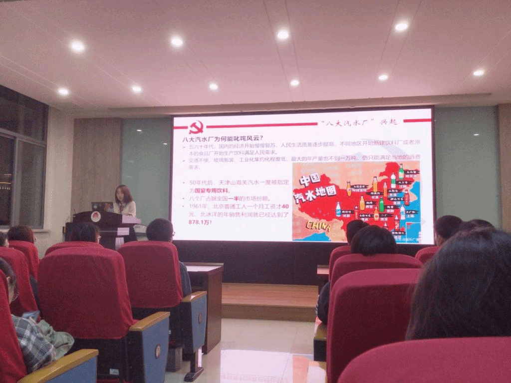 陈嫣首先从冰峰、崂山可乐等老牌饮料引入话题,探究了五六十年代我国八大汽水厂兴起的主要原因。她认为,一方面是由于五六十年代国内经济开始慢慢复苏,人民生活质量逐步提高,对饮料的需求日益增大,另一方面,当时的饮料厂工业化、集约化程度低,只能满足当地的消费需求,从而形成了“八厂鼎立”的格局。