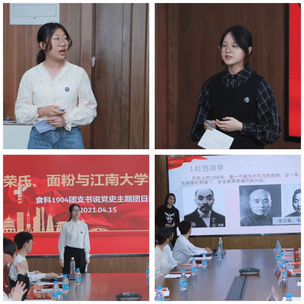 的渊源”主题完成第一阶段的实践学习和第二阶段的理论研讨。紧接着,食科1904团支书卢梦娇开始了第三阶段的党课分享。她讲述了荣氏家族的传奇一生,总体概述了三代荣氏代表对国家发展做出的贡献。团支部成员姜成辰、崔静、章灏三位同学分别从“面粉大王”“红色资本家”“近代教育事业先驱者”三个角度进行了深入的研究和探讨,并结合自身实际分享了自己的心得和感悟。