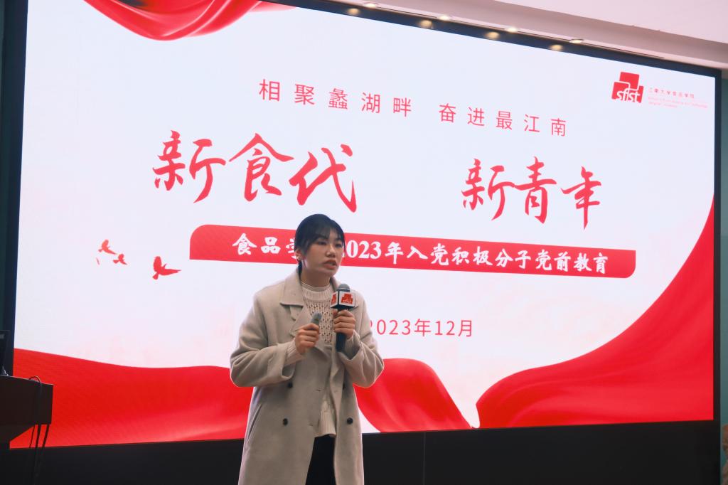 油脂与植物蛋白研究中心博士党支部书记孙彦文分享自己的入党故事和踏上研究生阶段之后的新征程新思考,并介绍省级样板党支部建设情况,希望同学们感受时代精神、肩负青年责任、真学真做真行。