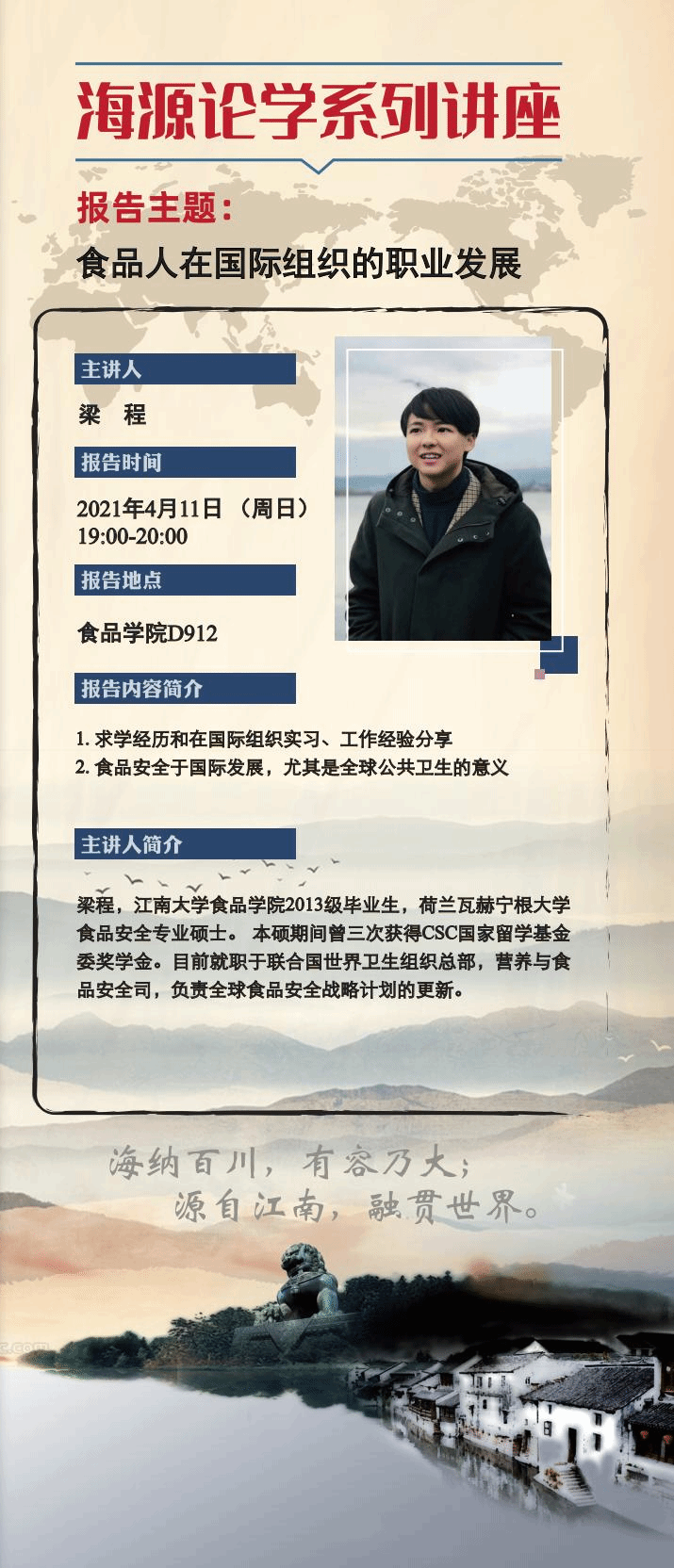 D912隆重举行并取得圆满成功。本次讲座嘉宾邀请了优秀校友梁程作题为“食品人在国际组织的职业发展”的线上报告,小黄书