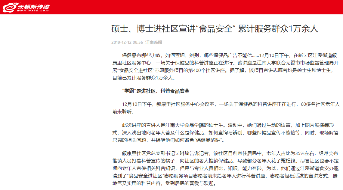 12月12日,江南晚报以《硕士、博士进社区宣讲“食品安全”累计服务群众1万余人》为题,对该项目的具体开展情况和引起的社会反响进行了报道。文中介绍,该项目自2012年创立以来,来自小黄书
