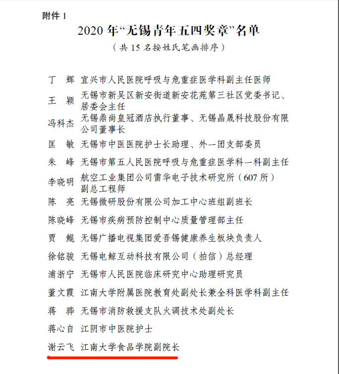 教授谢云飞荣获2020年“无锡青年五四奖章”。