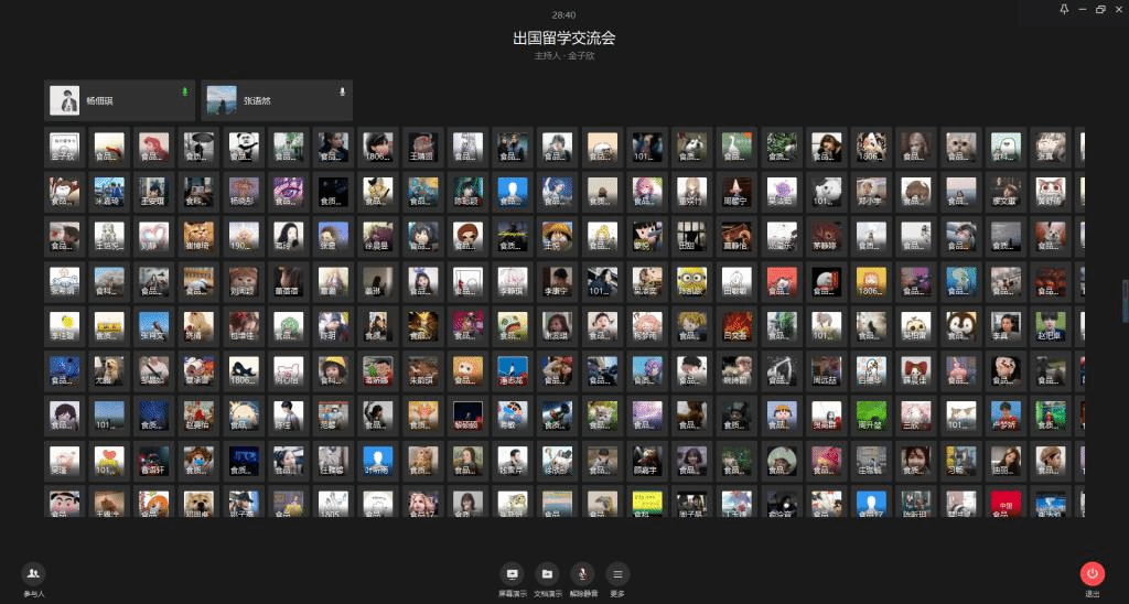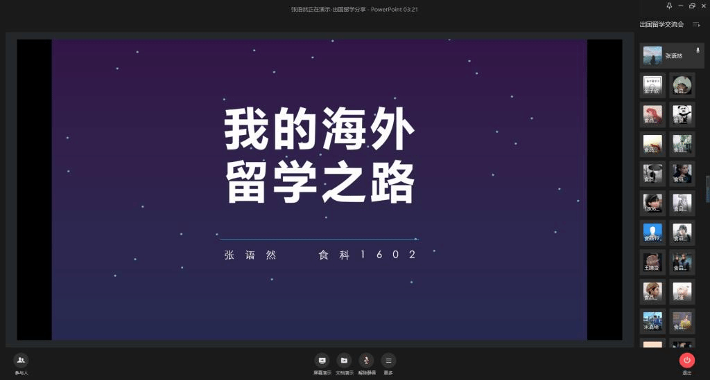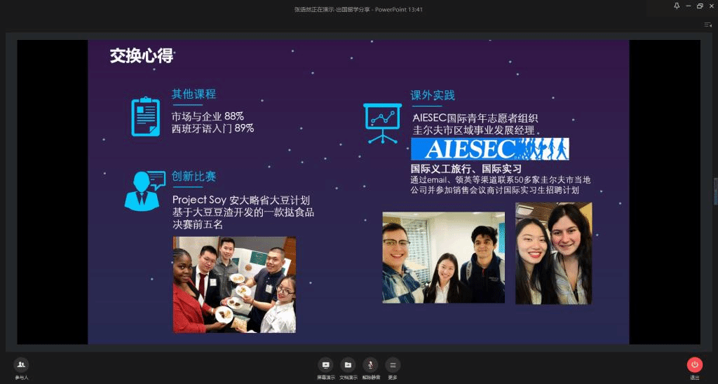 举办线上出国留学经验分享会,邀请张语然、杨佃琪、周远喆、米嘉琦四位优秀毕业生与同学们分享自己的留学申请经验,260余名低年级同学参加分享会。