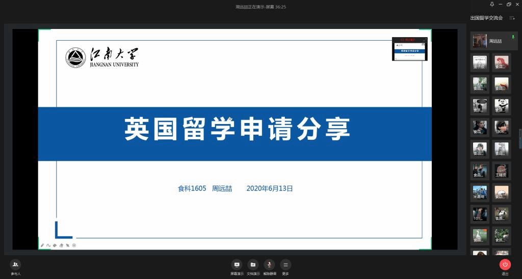 接下来,成功申请爱丁堡大学的周远喆以时间线的形式呈现出自己申请留学英国的全过程。大三开始准备材料,丰富经历,到暑期确定学校,写好推荐信;大四上学期关注学校的申请开放时间,及时提交申请材料。他还分析,由于今年全球疫情的原因,明年的留学竞争势必会更加激烈,所以提前做好准备最为关键。