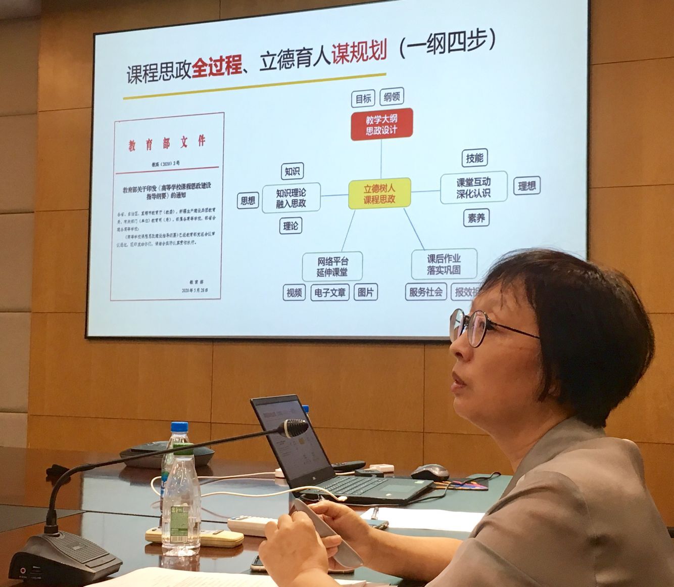 在专题报告环节,张云霞教授做了“课程思政建设思考--学习《高等学校课程思政建设指导纲要》”的主题报告。她从《纲要》的背景、意义和具体要求方面进行了解读,并从课程思政建设的目标及内容谈起,通过分享其他高校效果较好的课程思政案例,和与会老师一起探讨了如何结合小黄书