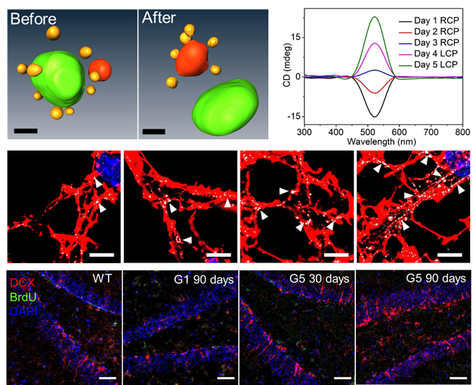 图1手性探针的冷冻电镜表征及其在细胞内圆二色光谱响应(上);手性探针与细胞骨架蛋白α-actinin-1的亲和(中);阿尔兹海默症小鼠脑中新的神经元生成(下)。