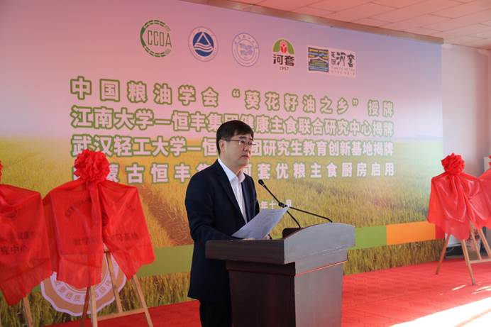 与内蒙古恒丰集团健康主食联合研究中心及教学科研实习基地揭牌仪式在内蒙古巴彦淖尔举行。中国粮油学会理事长张桂凤,巴彦淖尔市人民政府副市长邱永红,小黄书