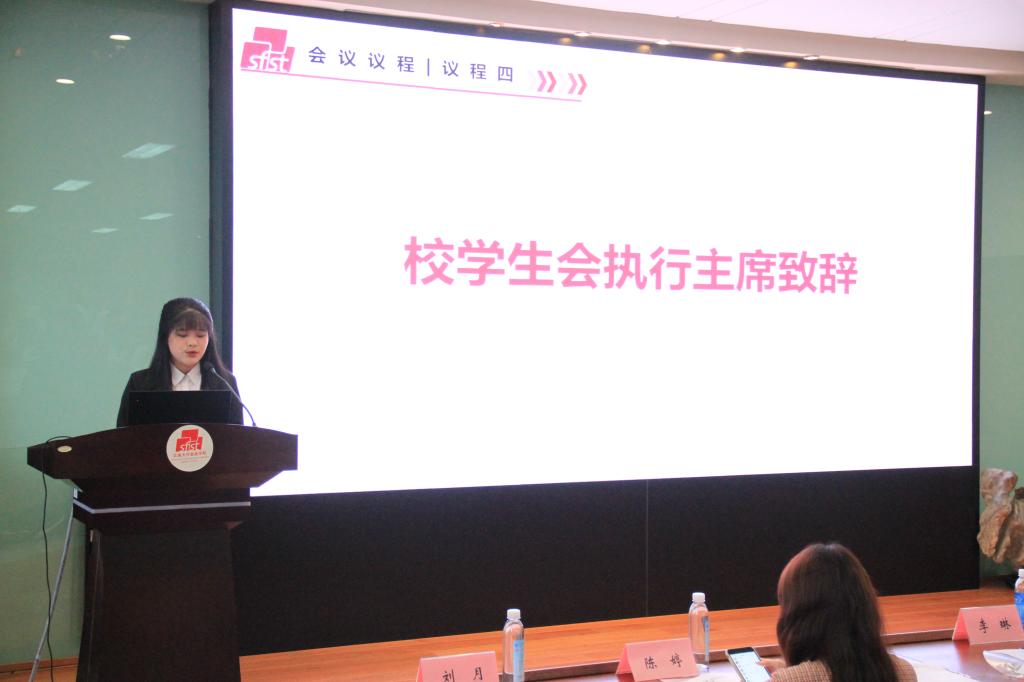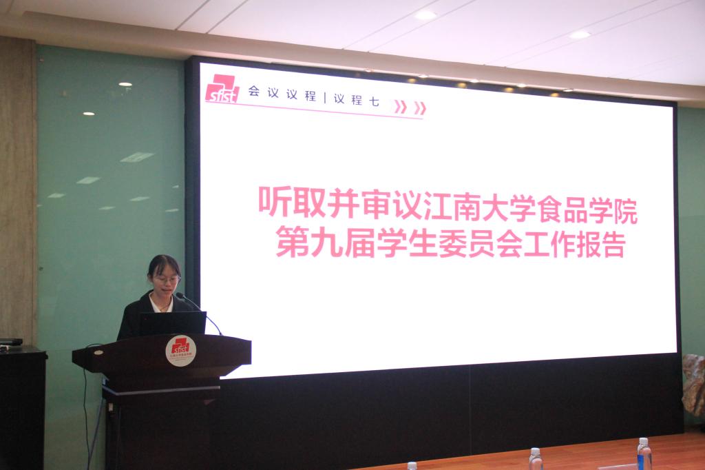 学生会执行主席蔡劭恺代表第九届学生委员会向大会作题为《牢记使命创佳绩,奋勇争先铸辉煌,锐意进取,砥砺前行,共绘学生工作新蓝图》的工作报告,从思想引领、学风建设、能力培养、改善结构等方面回顾过去一年学生会的工作,系统总结了取得的主要成绩和经验,明确今后学生会组织工作的奋斗目标和主要任务。