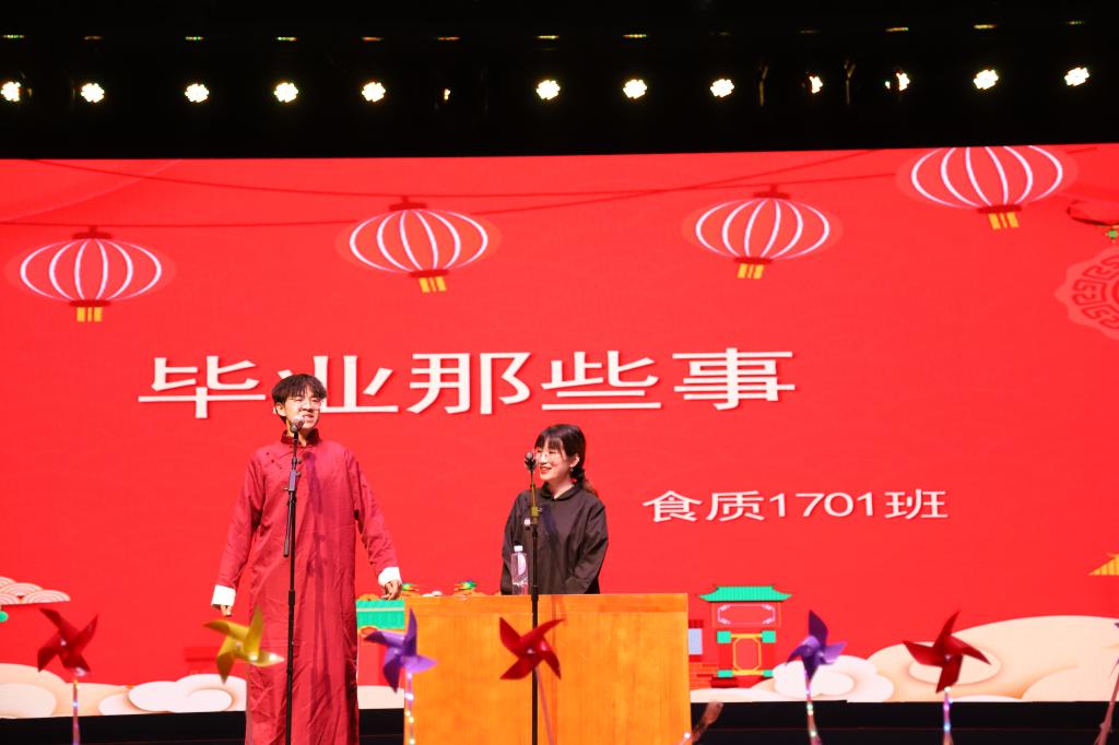 “舞动青春•梦想启航”篇章,食科1703班带来一首热血澎湃的《少年》,拉开了晚会的序幕。食科1704班集体表演了生动形象的光影戏,勾起了同学们对大学四年往事的回忆。欧阳思颖等同学《When we dance》的热辣舞蹈燃起全场。“此岸青春•彼岸年华”篇章,食科1707班的舞台剧、食科1706班的《干杯》和钢琴演奏《贝多芬春天鸣奏曲》生动活泼地演绎了大学四年的青春年华,食科1705班带来歌舞《达拉崩吧》,青春的活力在他们身上展现得淋漓尽致。食科1702班、食科1708班、食科1709班带来毕业祝福视频。“青春拂晓•圆梦今朝”篇章,马国娇等带来的舞蹈《Cutie Sexy Ladies》、食科1701班的相声《毕业那些事》、ATF器乐部的《权利的游戏》、研究生尹健等带来的歌曲《江南》,让大家一同再次领略江南的风光。副班们的歌曲串烧开启了“青春逐梦•行远思恩”篇章,将大家的思绪拉回四年前那个让彼此相遇相识的夏末,由班主任带来的歌曲《祝你一路顺风》、辅导员带来的歌曲《再见》传递出浓浓的不舍之情,将晚会带入高潮。