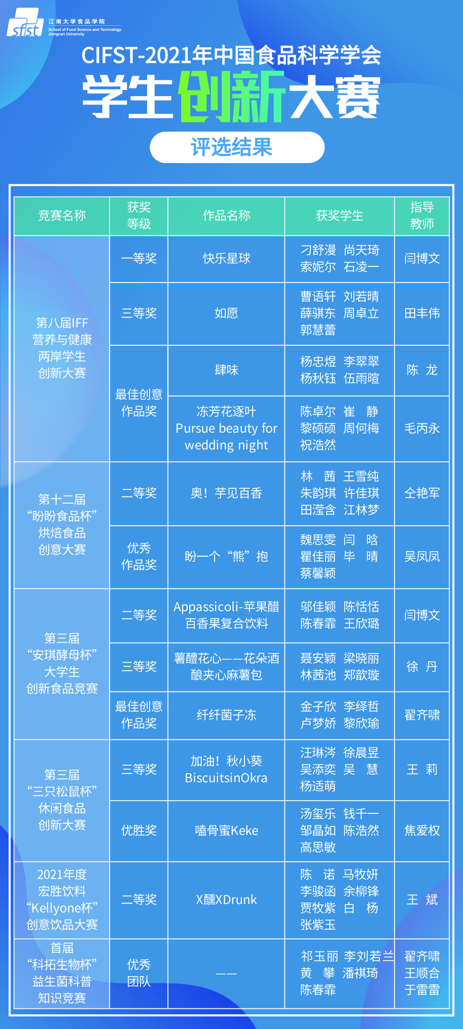 食品学子在160余所高校、1300余支参赛队伍中脱颖而出,获第八届IFF营养与健康两岸学生创新大赛一等奖1项、三等奖1项、最佳创意作品奖2项;第十二届“盼盼食品杯”烘焙食品创意大赛二等奖1项、优秀作品奖1项;第三届“安琪酵母杯”大学生创新食品竞赛二等奖1项、三等奖1项、最佳创意作品奖1项;第三届“三只松鼠杯”休闲食品创新大赛三等奖1项、优胜奖1项;2021年度宏胜饮料“Kellyone杯”创意饮品大赛二等奖1项;首届科拓生物杯益生菌科普知识竞赛优秀团队奖1项。学院获第三届三只松鼠杯休闲食品创新大赛优秀组织单位奖。