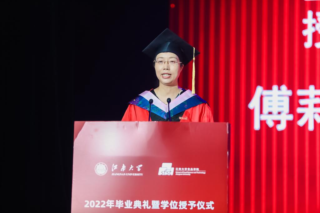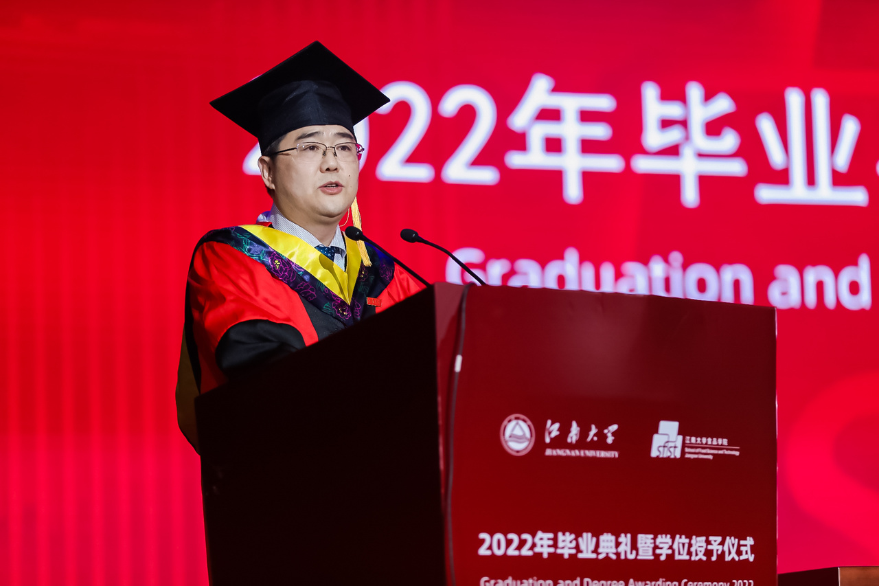 院长刘元法教授向全体毕业生致以临别寄语。他指出:“人以德为先,民以食为天。厚德载物,厚物载德,此物为食品也”。他叮嘱同学们身处百年未有之大变局,面对纷繁多元的社会,要从更好满足人民美好生活需要出发,树立“大食物观”,争做“未来食品人”,具体而言:一要做食品人,更要打破食品的边界;二要做中国食品人,更要做世界食品人;三要做食品人,更要做补天人。他希望同学们奔跑在历史大潮和人生实践中,尽情挥洒江南食品人的青春力量。