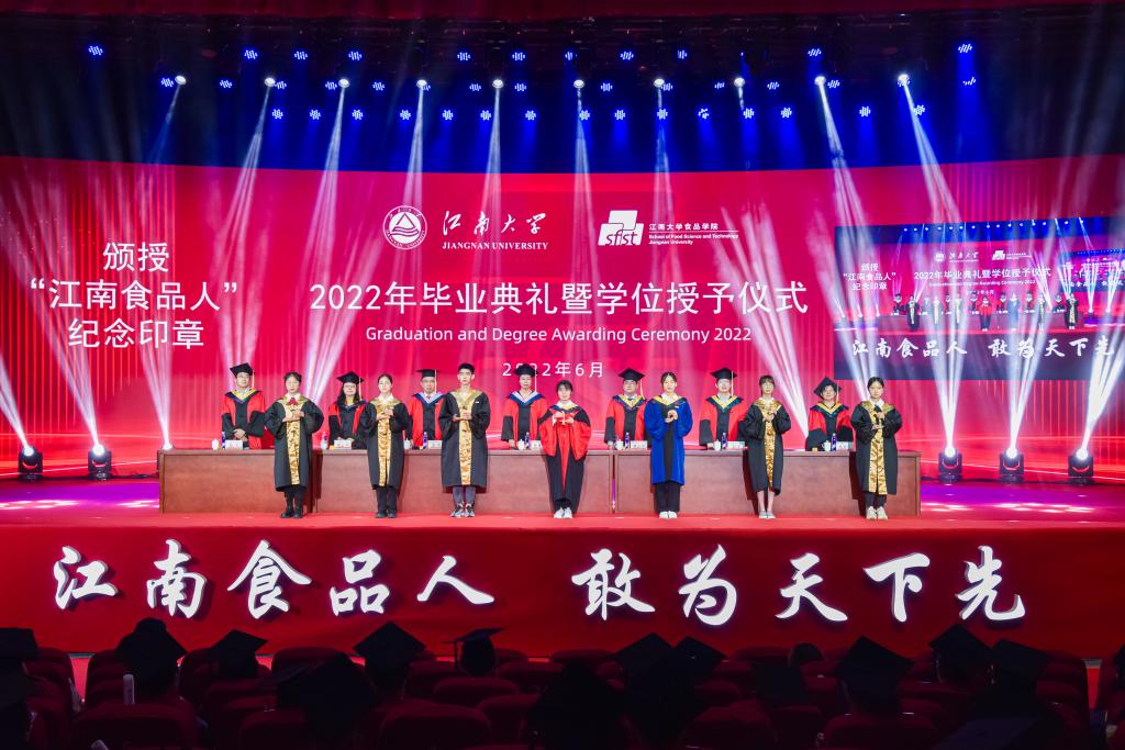 全体院领导还为2022届毕业生代表颁授“江南食品人”纪念印章。这一枚枚刻有院训的实名印章,代表着永远如水晶般的纯洁与剔透,引领着毕业生一生弘扬“江南食品人,敢为天下先”的文化与精神。