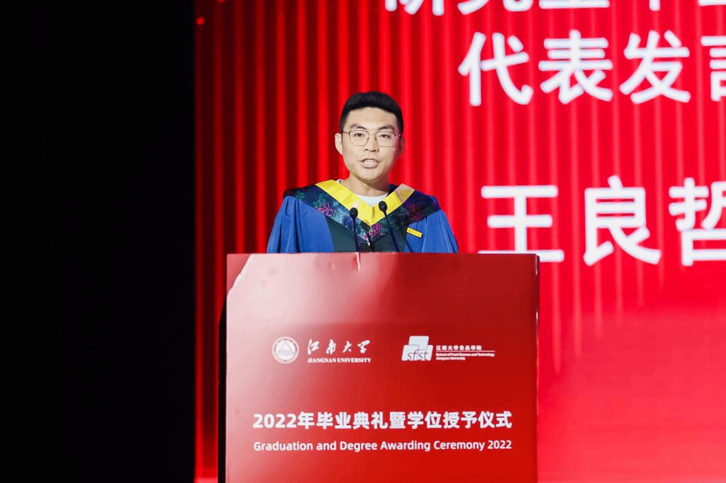校十佳研究生、国家奖学金获得者、优秀党务工作者王良哲作为研究生毕业生代表发言。他感谢老师们给予自己不断尝试的勇气与动力,并表示一定会带着食品精神的烙印乘风破浪、勇闯人生。