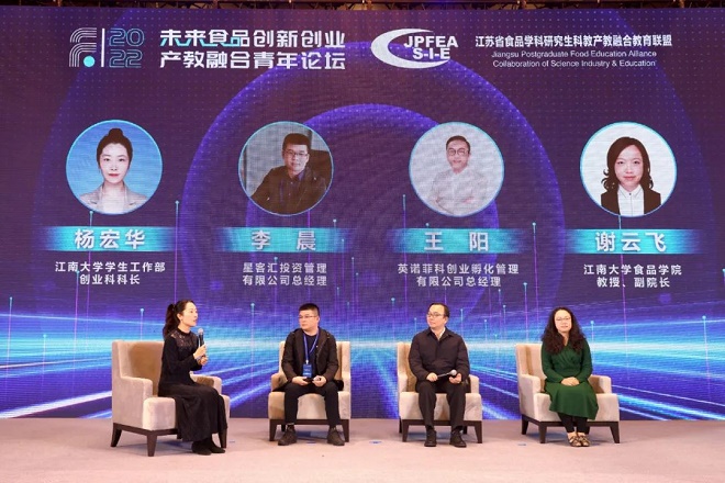 论坛的最后环节是未来食品创新创业圆桌会议。南京星客汇投资管理有限公司总经理、大学生创新创业竞赛资深评审李晨,苏州英诺菲科创业孵化管理有限公司总经理、大学生创新创业竞赛资深评审王阳,小黄书