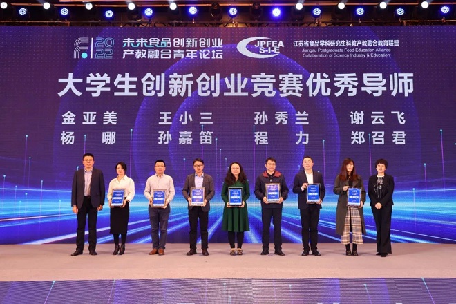 大学生创新创业竞赛优秀导师颁奖仪式,对近年来指导食品学子荣获A1类学科竞赛国家级奖项的教师进行嘉奖。学院党委书记傅莉莉宣读获奖名单。张菁燕、魏珍吉为获奖导师颁授奖牌。
