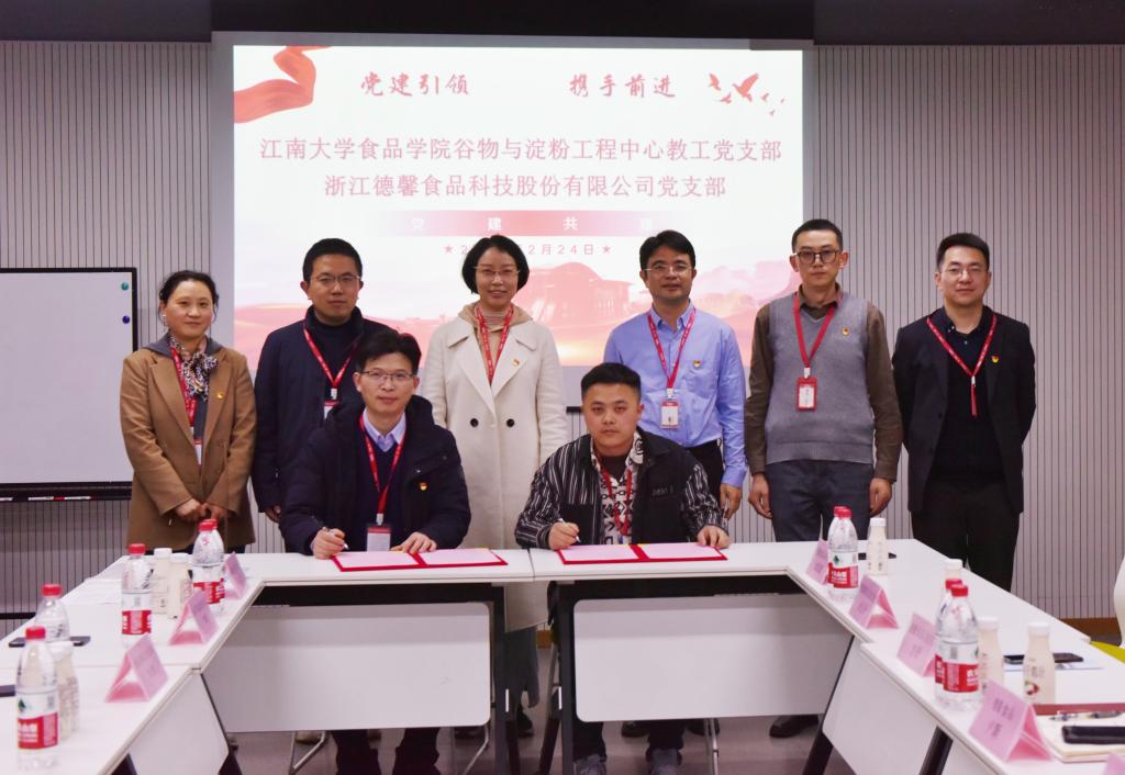 谷物与淀粉工程中心教工党支部与浙江德馨食品科技股份有限公司党支部共建签约仪式。两支部将以党建为纽带,进一步联合探索党建工作创新,激活基层党组织活力,拓展校企合作新领域。