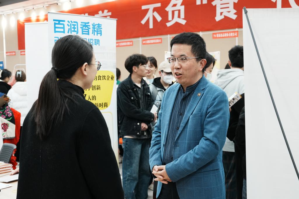 招聘会现场,各家企业通过海报、展板、手册、视频、产品实物等多种形式进行宣传,竞相抛出橄榄枝。前来应聘的同学们在用人单位展位前详细咨询、投递简历,进行深入沟通和交流,了解企业发展方向、岗位需求、薪资水平等信息。一些企业还进行现场面试,与学生达成初步意向。有用人单位HR表示,“我们特别喜欢江大食品的毕业生,也愿意投入成本培养他们。”