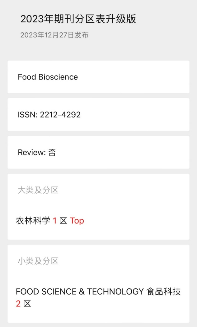合作主办的食品类期刊《Food Bioscience》升至2023年中科院期刊分区表农林科学1区TOP期刊行列。