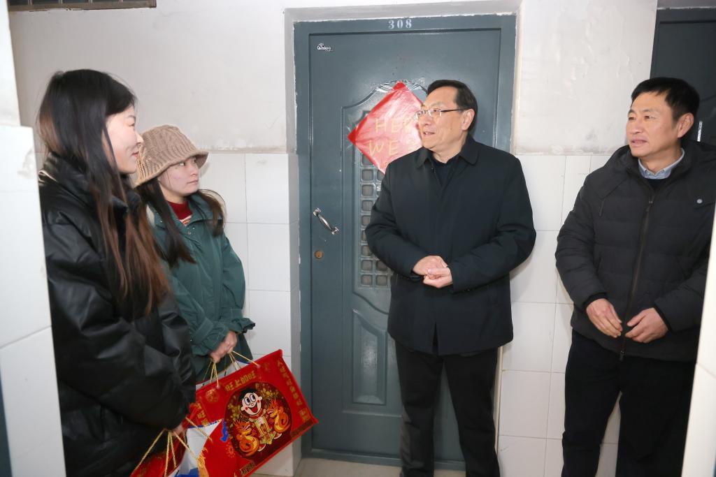 2月8日上午,校党委书记吴正国、副书记戴月波与职能部门及学院领导走访学生宿舍,亲切慰问留校学子。师长们用暖心的话语关怀着每名留校过年的学生,询问他们的生活情况、实际需求,叮嘱同学们充分利用寒假时间,勤学习、多思考,同时也要注意身体、保证安全,及时和家人、朋友、导师、辅导员保持联系。校领导还为同学们送上新春暖心大礼包,让留校学子感受到浓浓的年味以及家的温暖。