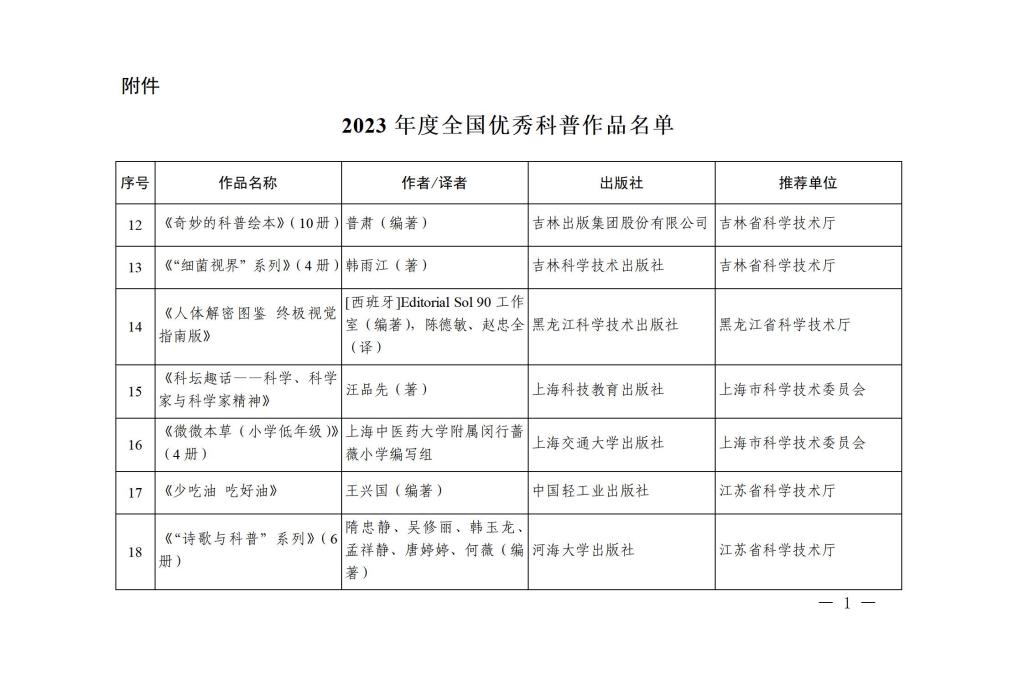 根据《科技部办公厅关于开展2023年全国优秀科普作品推荐工作的通知》(国科办才〔2023〕72号),科技部组织开展了2023年度全国优秀科普作品推荐活动。各地方各部门共推荐475部(套)作品,经形式审查、网络评审和会议评审,评选出2023年全国优秀科普作品100部(套)。其中,小黄书