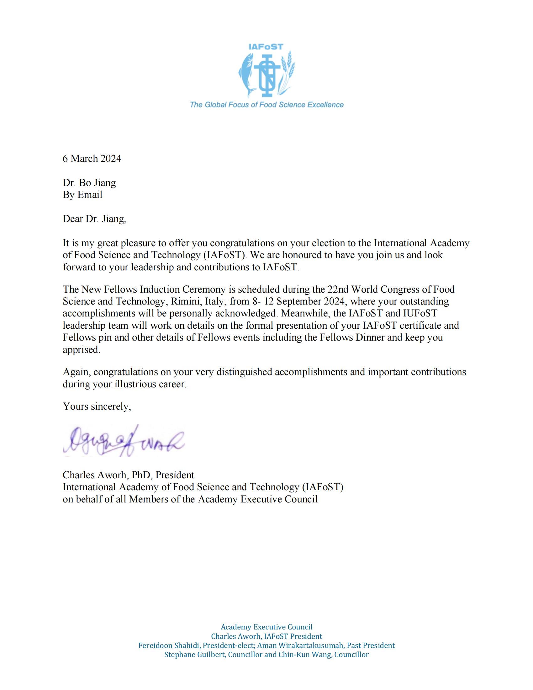 国际食品科学院(International Academy of Food Science and Technology, IAFoST)成立于1997年,是国际食品科技联盟(International Union of Food Science and Technology, IUFoST)设立的由杰出食品科技专家组成的学术机构,是一个独立的、非盈利性、非政府性的全球性学术组织。国际食品科学院院士由在全球食品科技领域做出突出贡献的国际杰出专家学者中选举产生,代表全球食品科技专家的最高荣誉。其院士每两年增选一次,每次新增不超过30人。