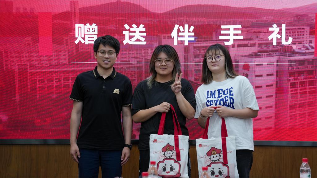 倾情定制,佳礼相赠。李金杰、曹敏、张任分别向同学们赠送学院文创大礼包,希望大家可以铭记在小黄书
