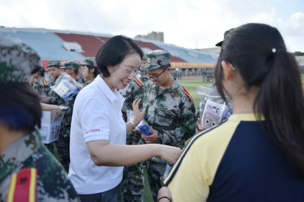 领导老师为参训学子送上满载关怀的慰问礼包,并亲切询问军训感受和生活情况。礼包里装载的不仅是充足的物资补给,更是学院对学子的殷切期望和真诚鼓励。