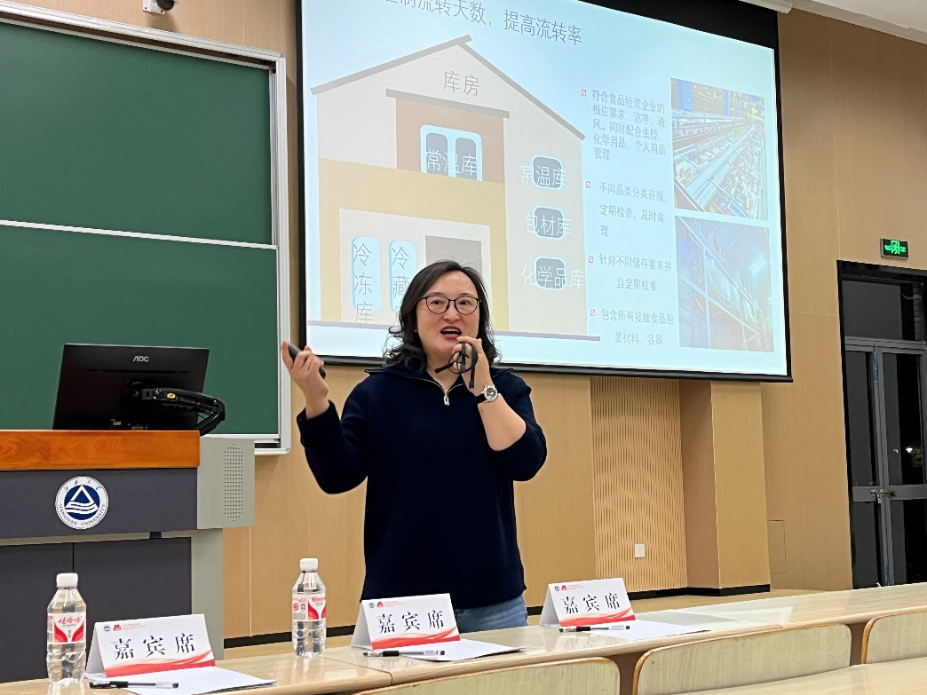 朱海晏结合自身经历与课堂互动,生动讲解质量保证的重要性,通过对食品产业链包括上游原材料供应、中游食品生产和加工、下游销售消费的分析,深入剖析影响产品的多项质量因素,并结合315晚会的案例阐述食安法在质量保证中的强力支撑作用。此外,她还针对人才需求提出建议,指出未来的岗位匹配会更加注重多技能的“复合”力,良好的沟通谈判能力也是不可或缺的成长发展条件。