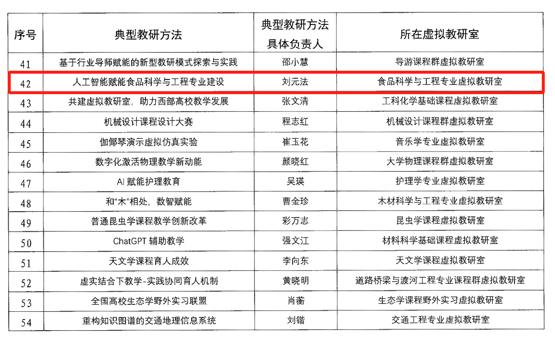 食品科学与工程专业虚拟教研室“人工智能赋能食品科学与工程专业建设”成功入选“典型教研方法”。
