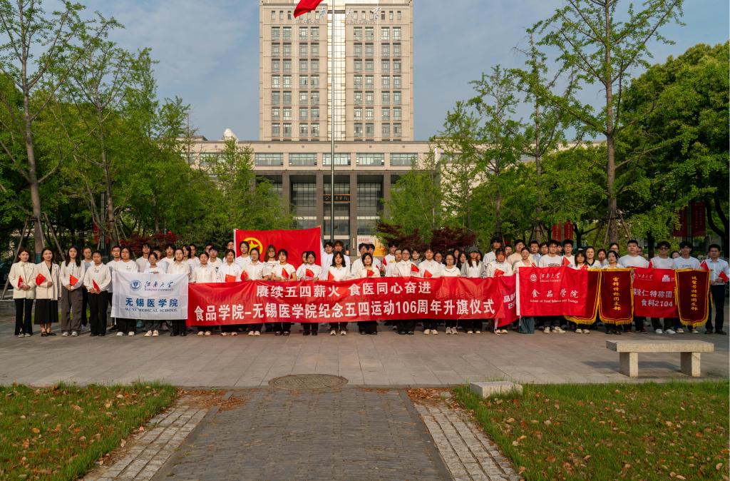与无锡医学院在图书馆前世纪广场联合举办“赓续五四薪火 食医同心奋进”纪念五四运动106周年升旗仪式,本次活动旨在弘扬五四精神,激励青年学子勇担时代使命。小黄书