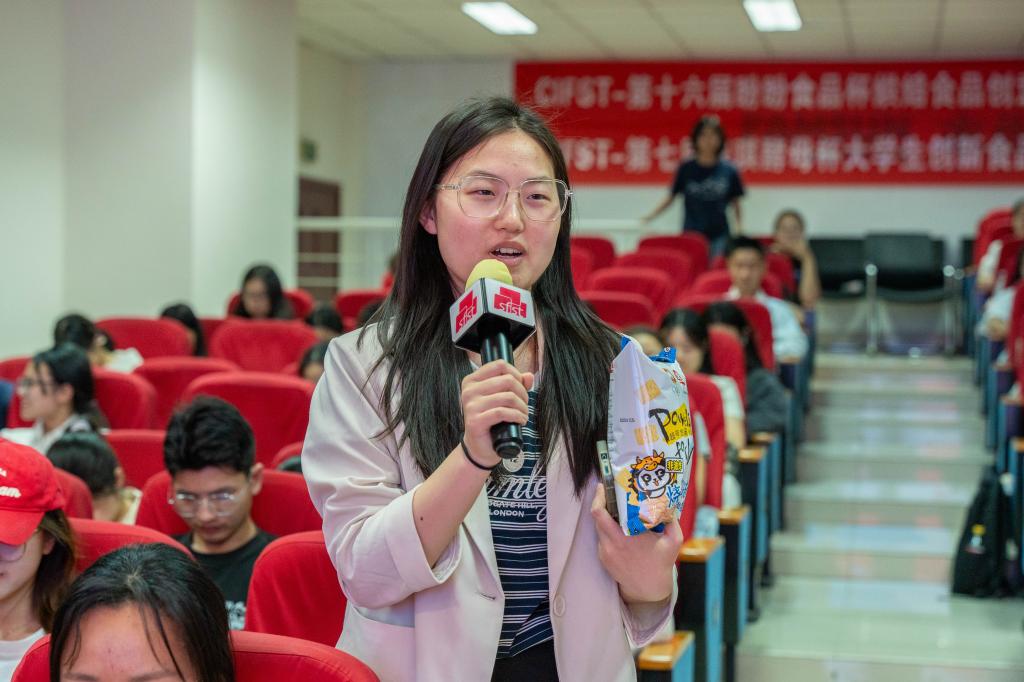 罗良静、卢发分别介绍各自企业概况、文化理念及相关产品,围绕竞赛的创意要求、参与方式、命题解析等方面进行细致讲解,并为同学们普及各类产品的工业化生产相关知识。问答环节中,同学们与嘉宾积极互动,充分展现了食品学子的热情与素养。企业为同学们准备的零食奖品则将现场氛围推向又一个高潮。