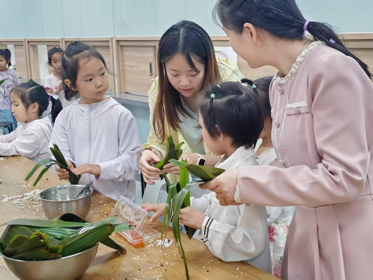 当“江小娃”们兴奋地举起自己的“劳动结晶”自豪展示时,幸福的气息随粽香弥漫开来。有的为同伴的创意造型点赞,有的热情分享包粽心得,还有的用剩余材料“研发”起“新产品”……包制结束后,老师们为每位“江小娃”送上精心定制的端午香囊,传递真挚的节日祝福。这场融合食品知识与传统文化的盛宴,不仅拓宽了视野、锻炼了动手能力,更拉近了“江小娃”间的心灵距离。