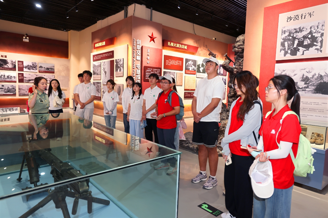 与石河子大学的青年学子共同前往47团沙海老兵红色区域,参观中国人民解放军进军和田纪念馆,聆听讲解员讲述沙海老兵横穿“死亡之海”——塔克拉玛干的英雄事迹:他们骁勇无畏,挺进和田,终其一生扎根建设南疆。展墙上镌刻着一位位英雄的名字,他们不慕名利,一句“和田驻军万不可退”的命令,让他们毅然决然将自己的一生献给了沙漠。“你们出过和田吗?没有。你们回过老家吗?没有。你们坐过火车吗?没有。”这连续三句沉重的“没有”,正是老兵们几十年如一日扎根新疆、热爱新疆、屯垦戍边的无声誓言。他们生动诠释着“胡杨精神”“老兵精神”“兵团精神”,用生命书写了一部艰苦创业、无私奉献的军垦诗篇。