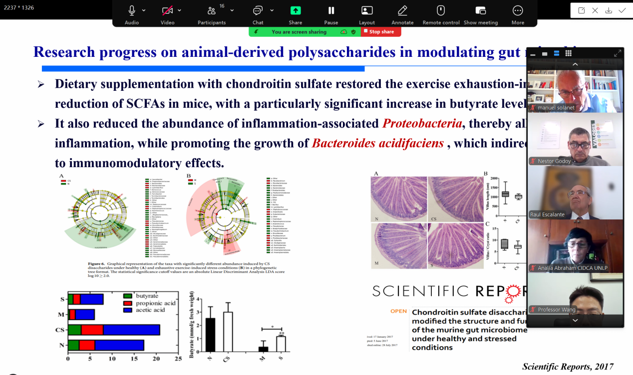 研讨会期间,中阿双方专家依次进行了精彩的专题报告。阿方专家首先登场,Analía G. Abraham博士探讨手工发酵食品、益生菌和益生元等活性物质的开发及功能评价相关研究;Pablo F. Pérez博士分析双歧杆菌在针对艰难梭菌的益生菌配方中的潜力;Néstor A. Godoy工程师分享Adecoagro公司改善营养的举措;Pablo Renzulli介绍阿根廷市场上的益生菌和益生元乳制品产业现状。中方专家同样贡献了高水平的研究成果,田丰伟教授介绍膳食多糖与肠道菌群相互作用的研究进展;王刚教授阐述与母乳喂养相关的双歧杆菌通过肠道菌群-α-亚麻酸和亚油酸代谢-肠肝循环轴缓解新生儿高胆红素血症的机制;杨波教授揭示双歧杆菌通过脂肪酸异构化和肠道菌群调节抑制小鼠结直肠肿瘤发生进展的作用。