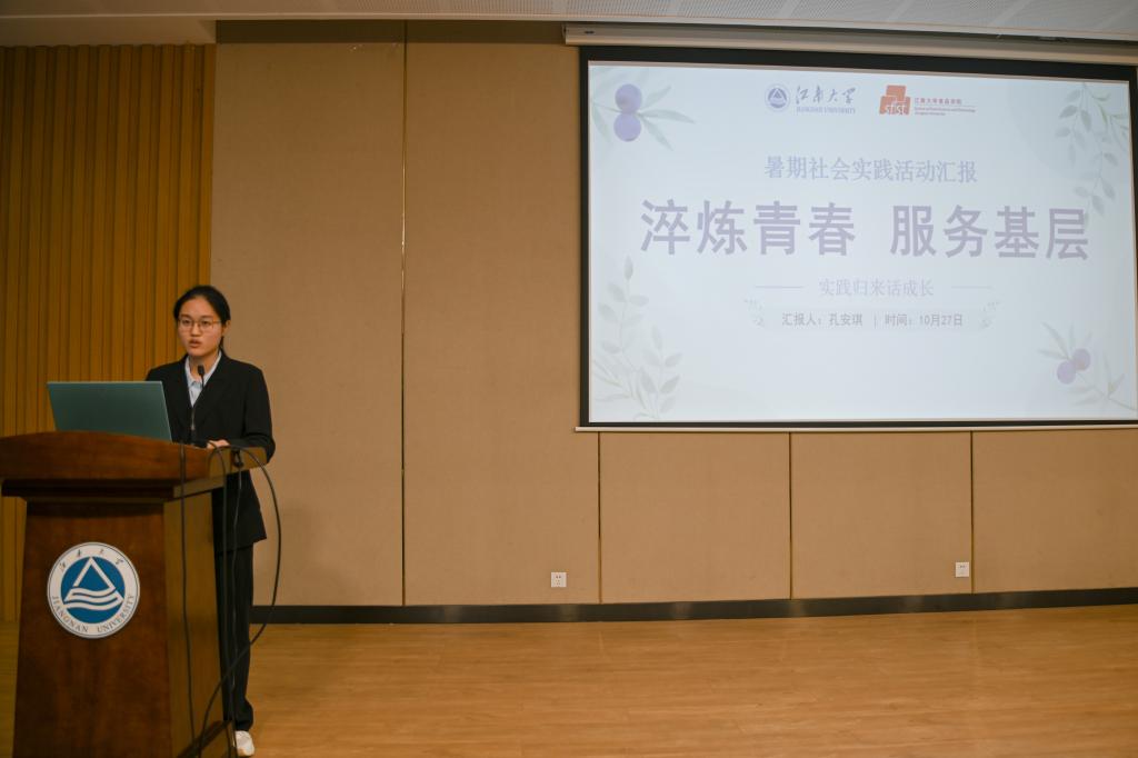 “南国北疆”社会实践团代表胡峰分享了团队联合石河子大学学子,在新疆这片热土上的故事,跨越4793公里聆听沙海老兵扎根边疆的英雄事迹,用食品科普助力乡村发展和儿童健康,切实发挥一流学科优势和青年的所学所思;“食光嵛你”社会实践团代表王沁梅介绍了团队赴福建福鼎嵛山岛,联合“清华大学乡村振兴工作站”,以科技赋能乡村产业,研发出低糖月饼与地瓜脆条,为海岛孩子开展食育课堂,为当地乡村振兴发展贡献江南力量;“华夏拾光者”社会实践团代表倪红箔分享了团队成员暑期在15座博物馆进行实践考察的收获,他们参观探寻馆藏珍品,感受历史发展变迁,体会中华文明生生不息的蓬勃力量,让厚重的历史与青春的脉搏同频共振;“赓续红色基因,共绘中国红”社会实践团代表王子凡分享了团队奔赴各处红色场馆的经历,追寻红色足迹,感受红色精神,食品学子们领悟“生逢其时,重任在肩”的责任与使命。