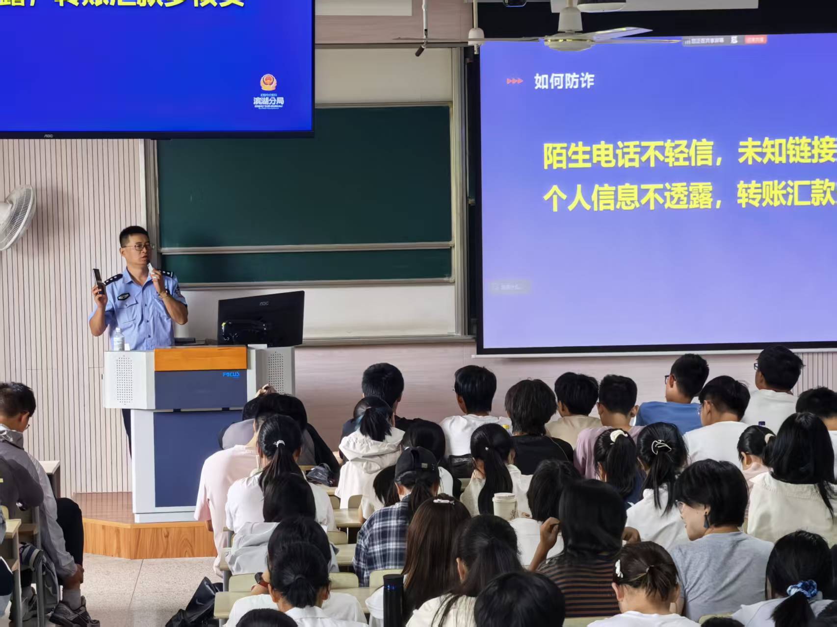 特邀滨湖公安分局雪浪派出所民警康伟锋,在25级本科新生辅导员穆元炜的主持下,于10月15日在第二教学楼D304主会场及D302分会场举办防诈骗专题宣传教育讲座。