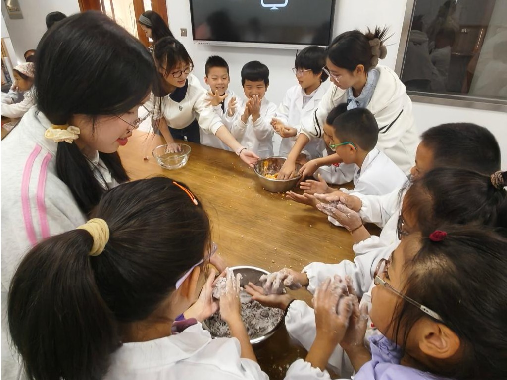 理论课程结束后,“江小娃”们化身“小小美食家”,在助教老师的引导下,大家耐心地揉捏芋圆、搓制珍珠,忙得不亦乐乎。最后,大家一起体验制作牛奶布丁,小心翼翼调配牛奶与吉利丁,等待凝固的“魔法时刻”。整个教室里弥漫着“江小娃”们的欢声笑语,抽象的科学原理,在孩子们亲手实践中也变得生动可触、趣味盎然。