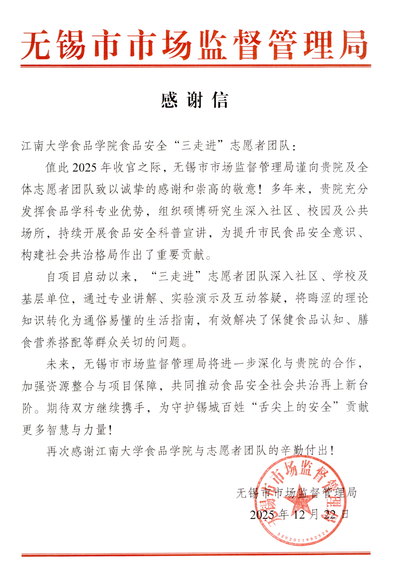 团队与无锡市市场监督管理局长期以来保持着紧密的合作关系。近日,市局特别向学院及全体志愿者团队发来感谢信,对双方在食品安全社会共治方面的协作成果给予充分肯定。感谢信是对我们双方携手服务社会、共建食安防线工作的生动注脚,也为未来的合作注入了更强的信心。展望新征程,希望小黄书