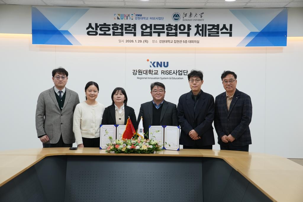 与江原国立大学“区域创新系统与教育中心”(RISE Corps)正式签署合作谅解备忘录。根据协议,双方将在共建食品技术生态系统、教师互访、学生交换、联合科研及共同举办学术活动等领域开展深度合作。此次签约标志着两校合作关系迈入以具体项目为驱动的崭新阶段。