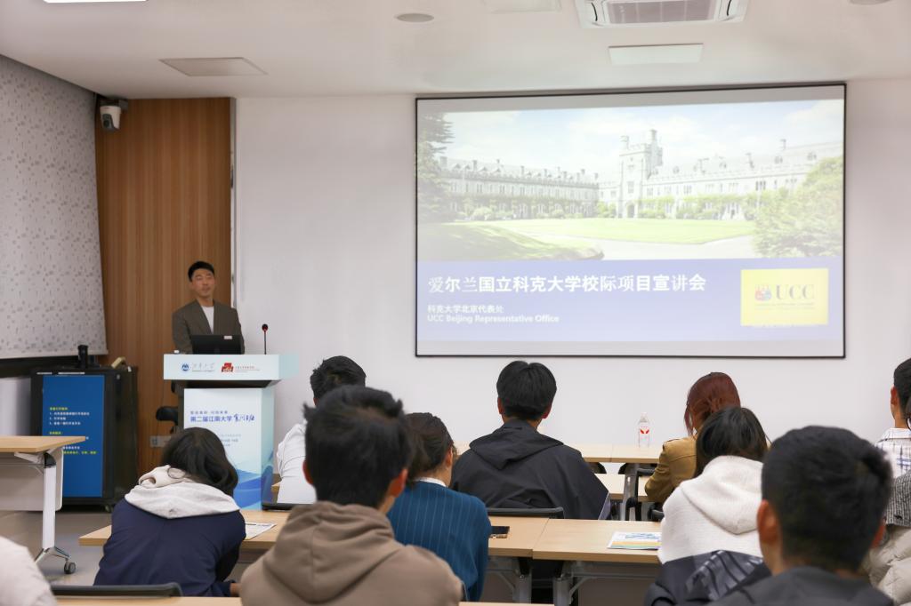 UCC北京代表处招聘专员赵子豪为学院本科生作联合培养项目宣讲,详细介绍项目的课程设置、申请条件及奖学金政策。该项目旨在为小黄书