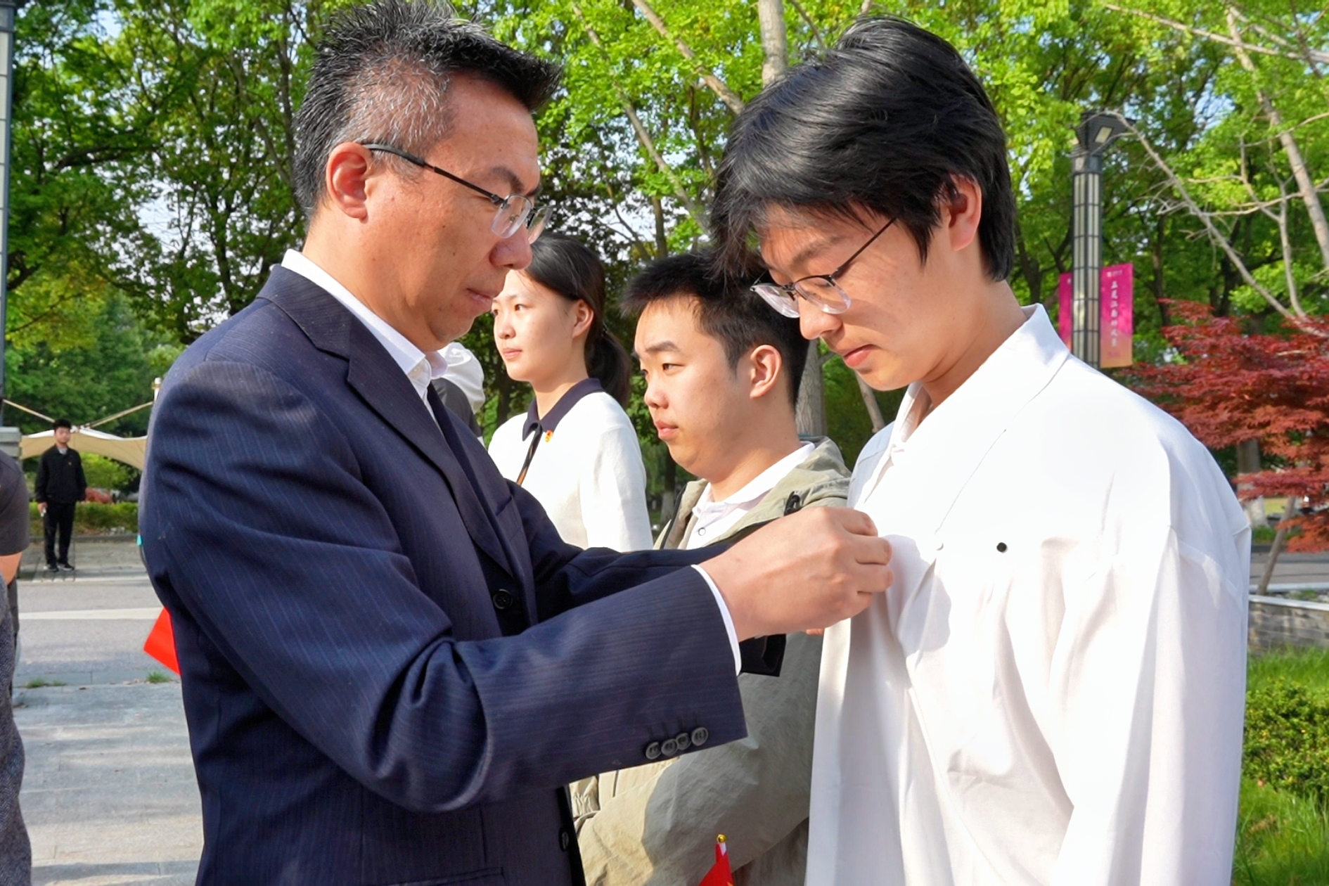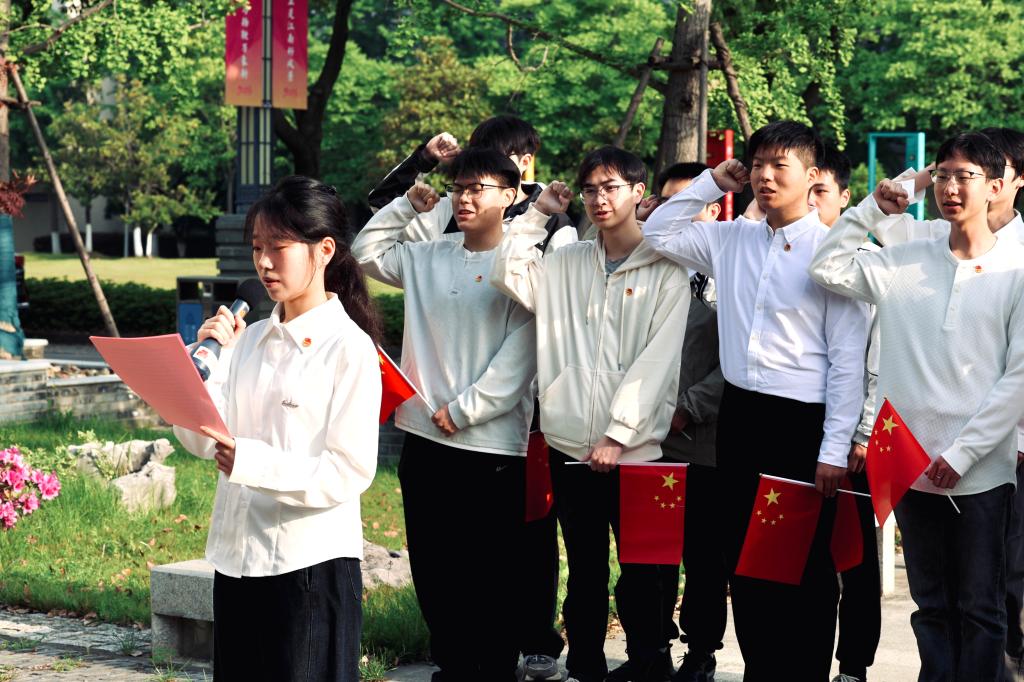 仪式上举行了庄重的新团员入团仪式。任轶博、马素伟、包羽为新团员代表佩戴团徽,勉励新团员牢记入团初心,在五四精神的感召下将团徽所承载的光荣与责任化作青春奋进的力量。随后,在无锡医学院临床医学(卓越医师班)2501李雨宸同学的带领下,全体新团员面向团旗庄严宣誓,在场老团员一同重温入团誓词。誓词铿锵,回荡广场,砥砺着每一位团员青年的入团初心与责任使命。