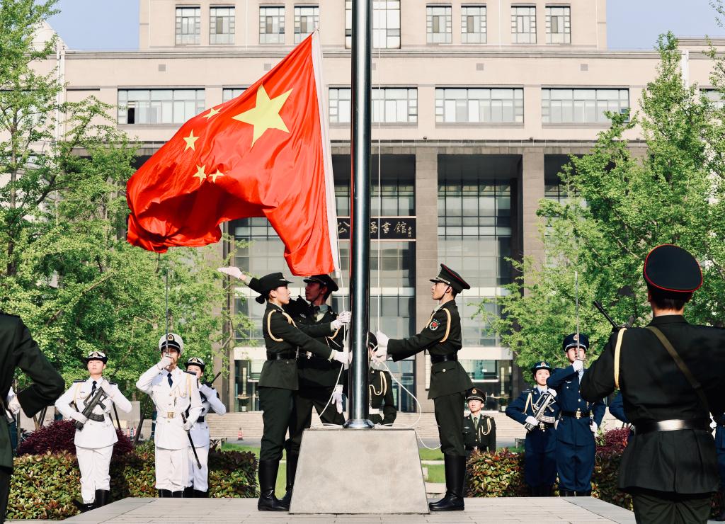 国旗护卫队队员身穿海陆空三军礼服,迈着铿锵的步伐,护卫着国旗走向升旗台。全场师生肃立注目、齐声高唱国歌,目送鲜艳的国旗冉冉升起,爱国情怀与使命责任感在每个青年人心中激荡。